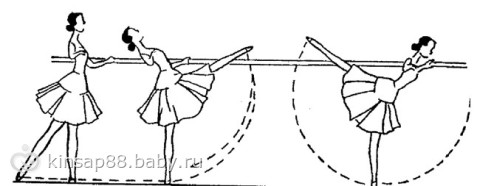 на затакт пр.н відводимо назад, руки відкриваємо в ІІ п. алянже (долоня направлена в підлогу)